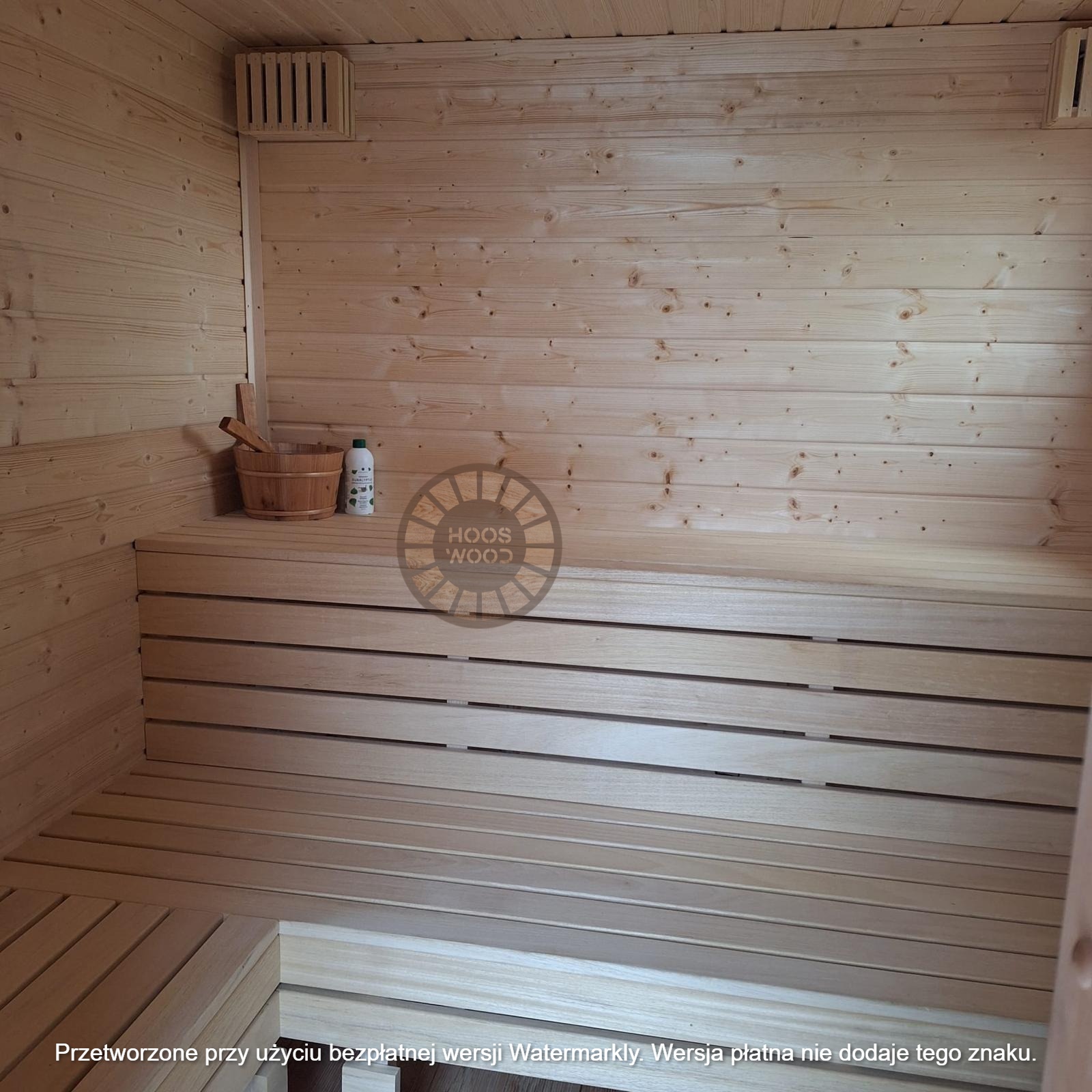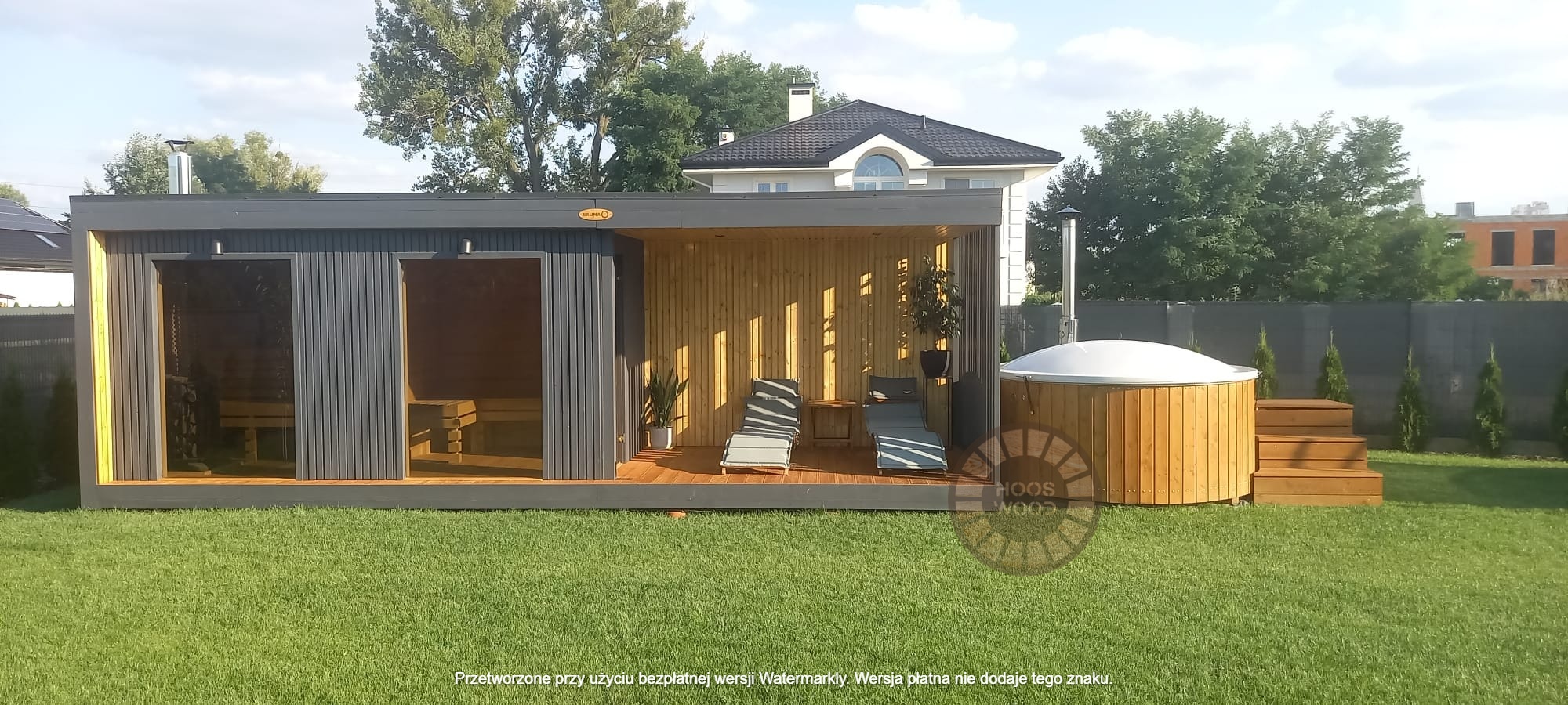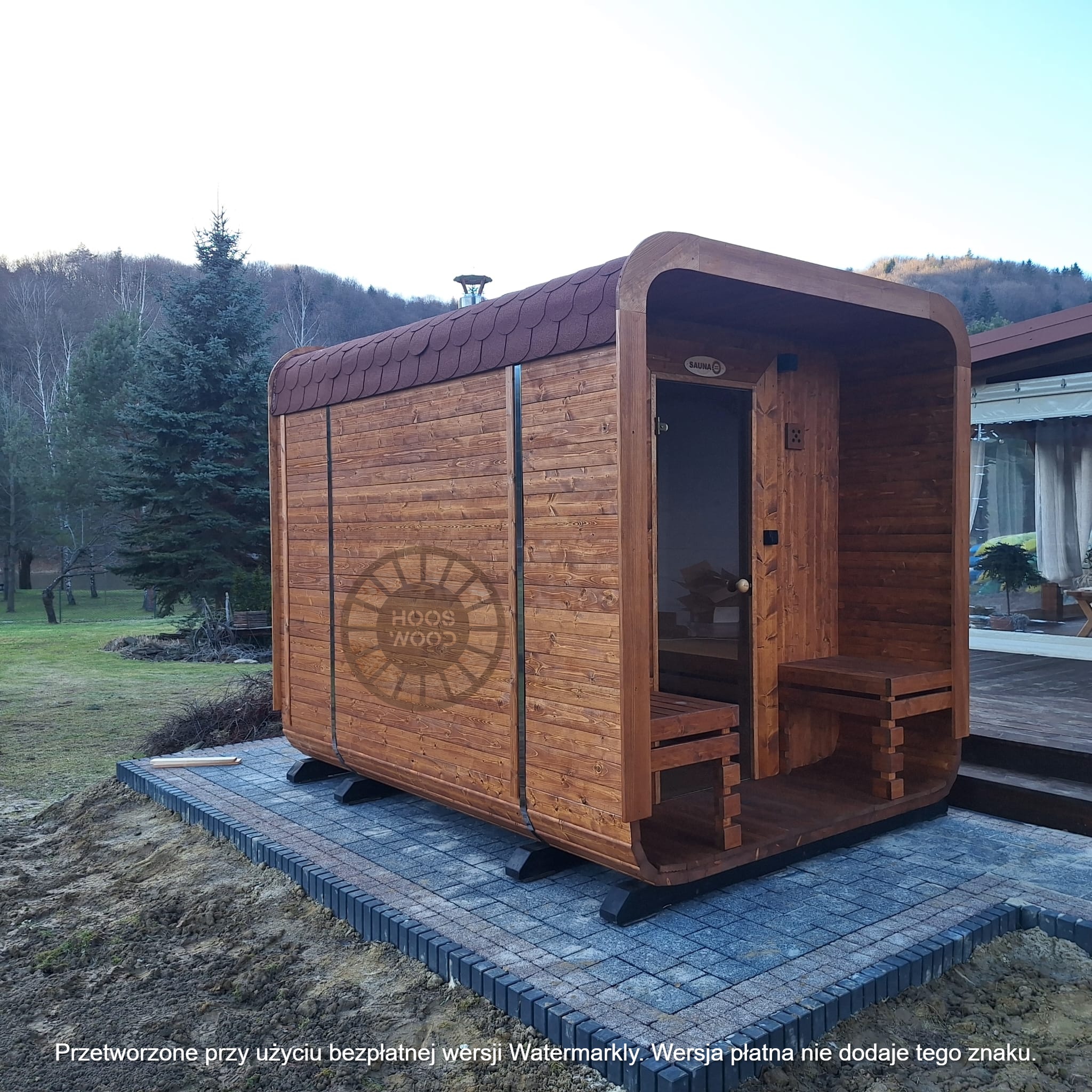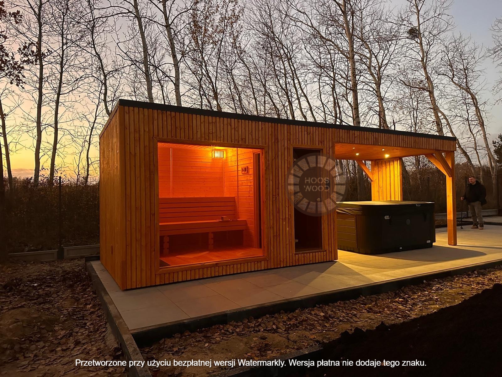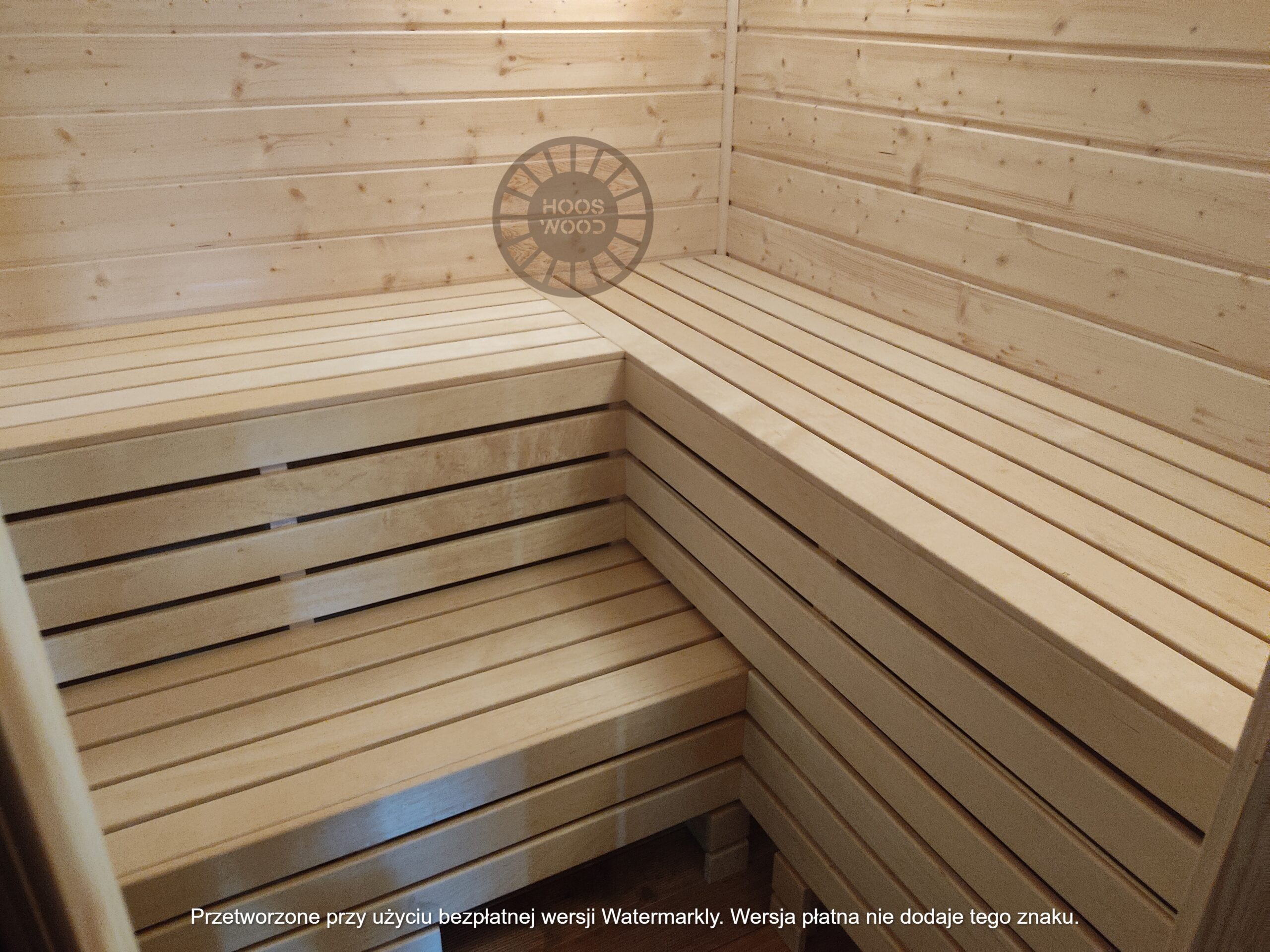 Firma Hoos Wood przedstawia saunę o wymiarach 2,40 × 5,60 m, tworzoną na indywidualne zamówienie (maksymalna długość modułu – 6 m). Sauna posiada pomieszczenie saunowe 2 × 2 m oraz taras przystosowany pod balię. Całość jest ocieplona 10 cm wełną, zabezpieczona folią paroizolacyjną i paroprzepuszczalną oraz deską elewacyjną dwustronną. Podłoga składa się z 5 cm styroduru, 8 cm kantówki i deski tarasowej. Konstrukcja stoi na trzech podstawach 10 × 10 cm, podbitych gumą dla ochrony przed wilgocią. Wyposażona w piec Harvia Cilindro PC 90 (opcjonalnie piec na drewno) z zabezpieczeniem ognioodpornym. Posiada podwójną wentylację, ławki dwupoziomowe z drewna abachi i hartowane, przyciemniane szyby 8 mm. Dach pokryty jest blachą, na spadzie montujemy rynny. W saunie zamontowano kinkiety drewniane z opcją LED oraz zewnętrzne oświetlenie.