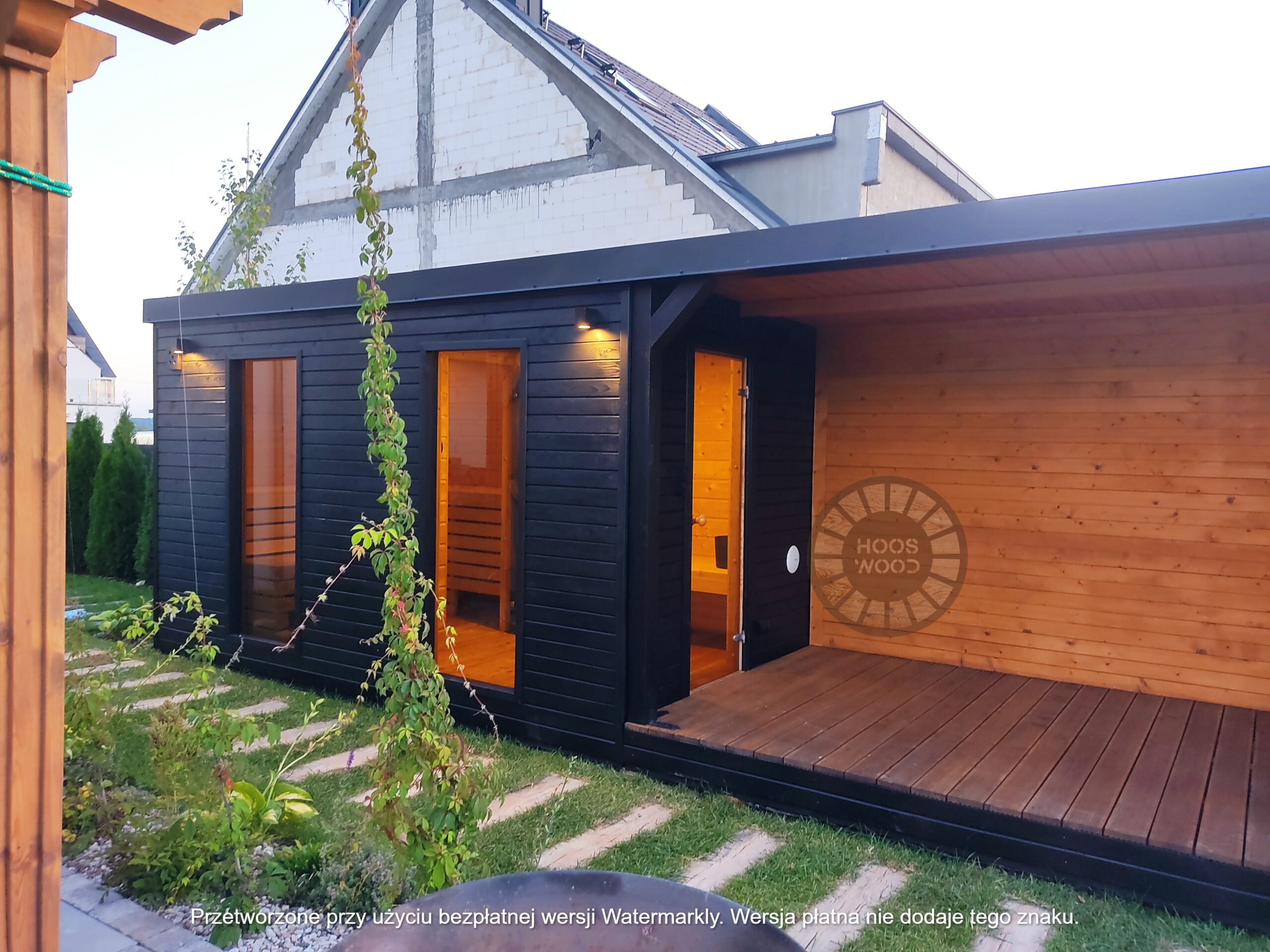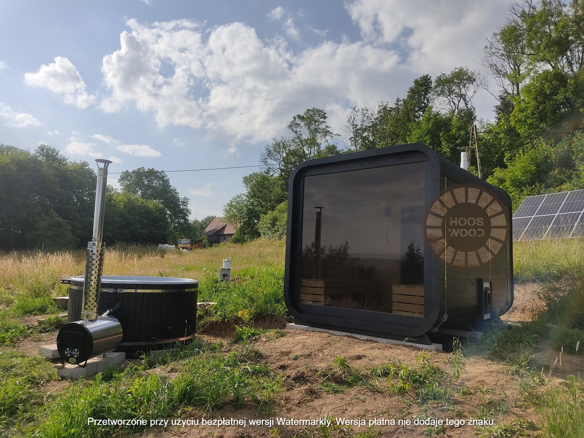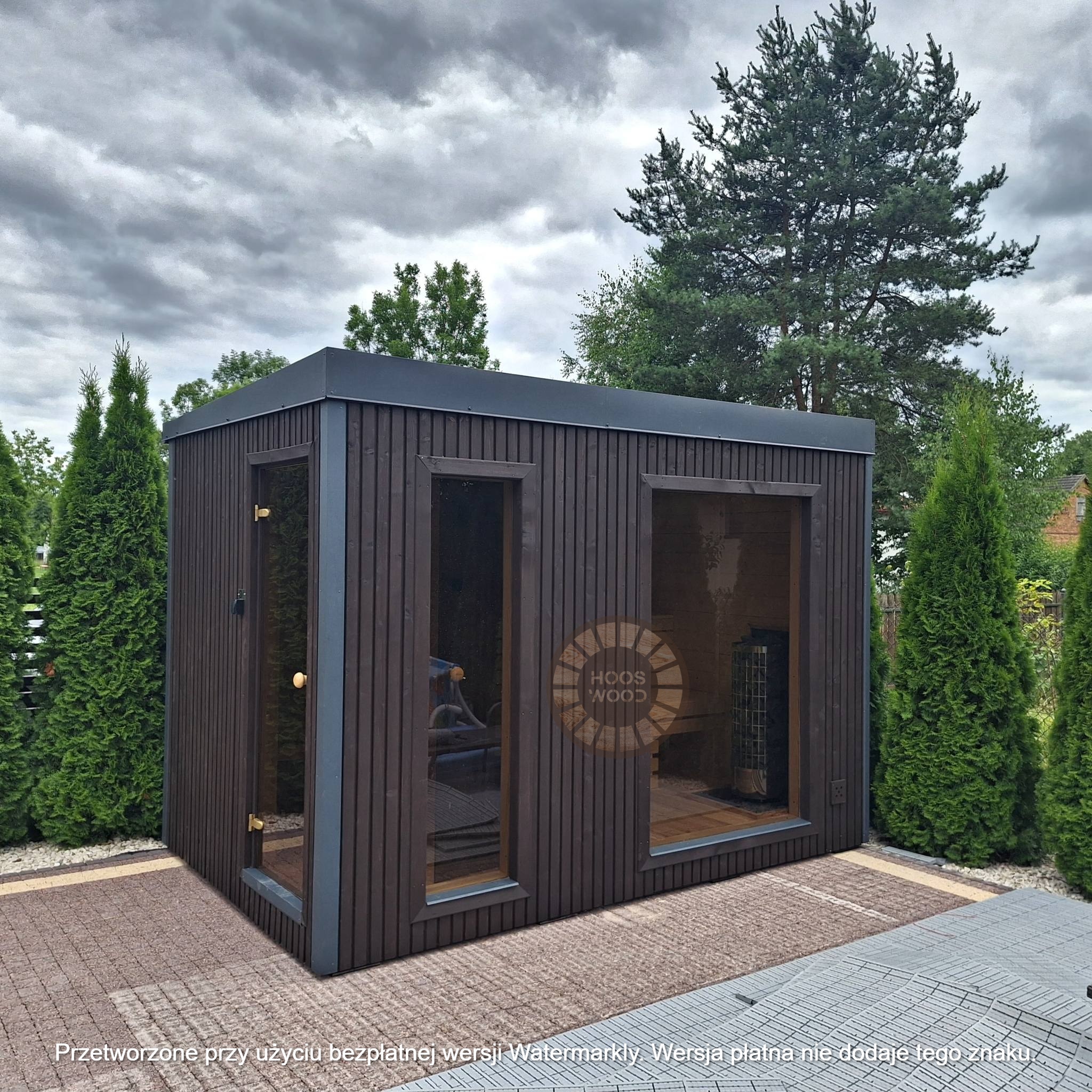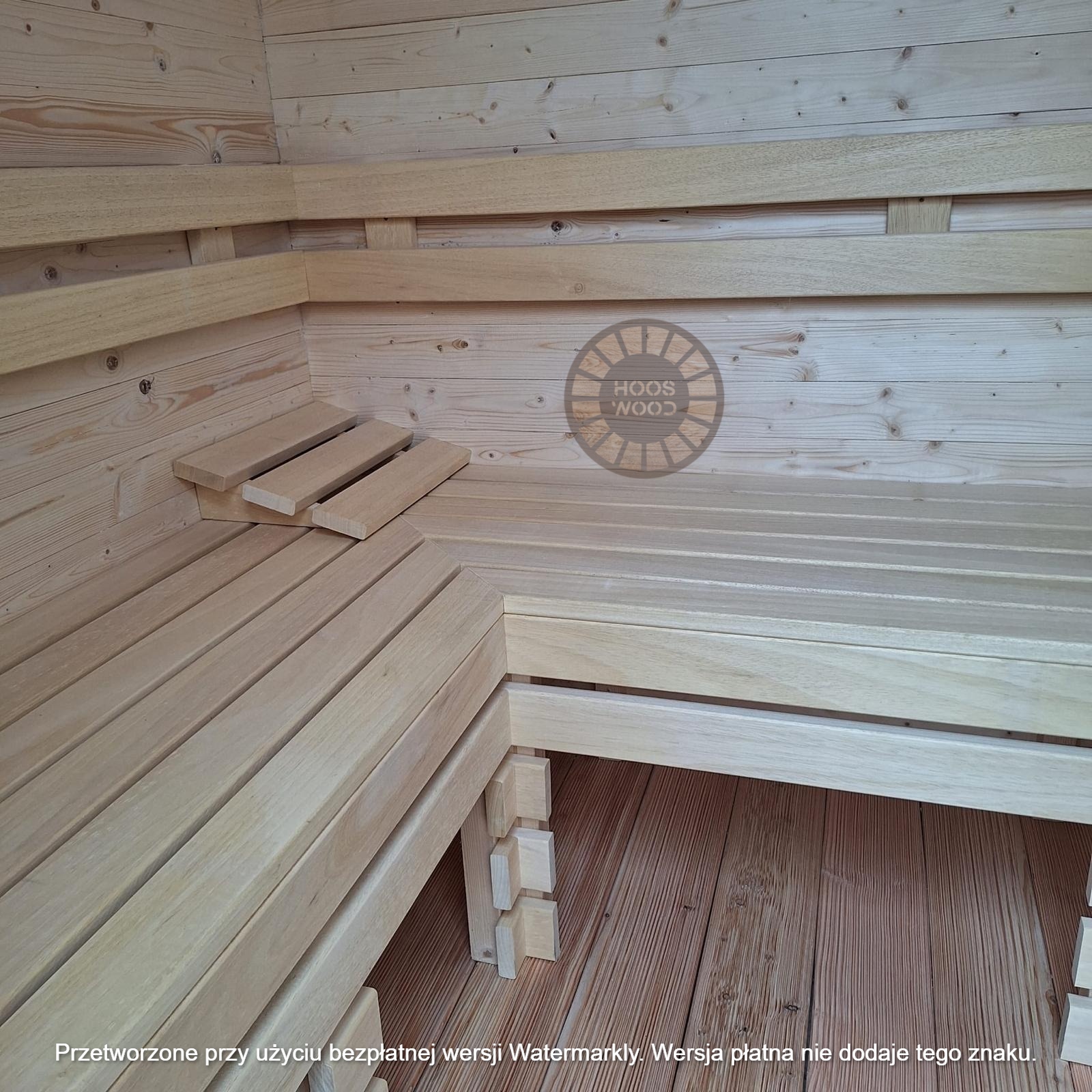 Firma Hoos Wood przedstawia saunę o wymiarach 2,40 × 5,60 m, tworzoną na indywidualne zamówienie (maksymalna długość modułu – 6 m). Sauna posiada pomieszczenie saunowe 2 × 2 m oraz taras przystosowany pod balię. Całość jest ocieplona 10 cm wełną, zabezpieczona folią paroizolacyjną i paroprzepuszczalną oraz deską elewacyjną dwustronną. Podłoga składa się z 5 cm styroduru, 8 cm kantówki i deski tarasowej. Konstrukcja stoi na trzech podstawach 10 × 10 cm, podbitych gumą dla ochrony przed wilgocią. Wyposażona w piec Harvia Cilindro PC 90 (opcjonalnie piec na drewno) z zabezpieczeniem ognioodpornym. Posiada podwójną wentylację, ławki dwupoziomowe z drewna abachi i hartowane, przyciemniane szyby 8 mm. Dach pokryty jest blachą, na spadzie montujemy rynny. W saunie zamontowano kinkiety drewniane z opcją LED oraz zewnętrzne oświetlenie.
