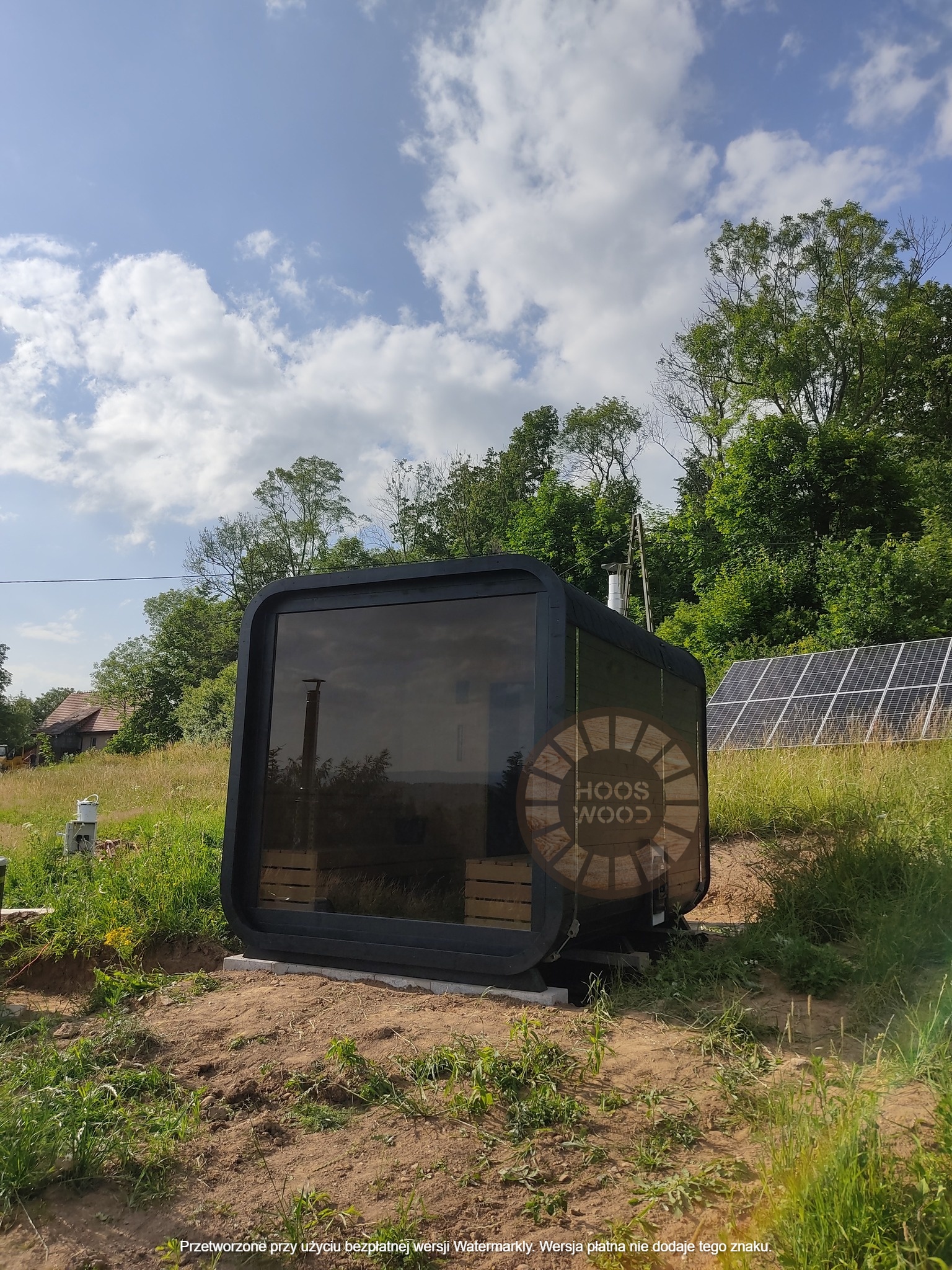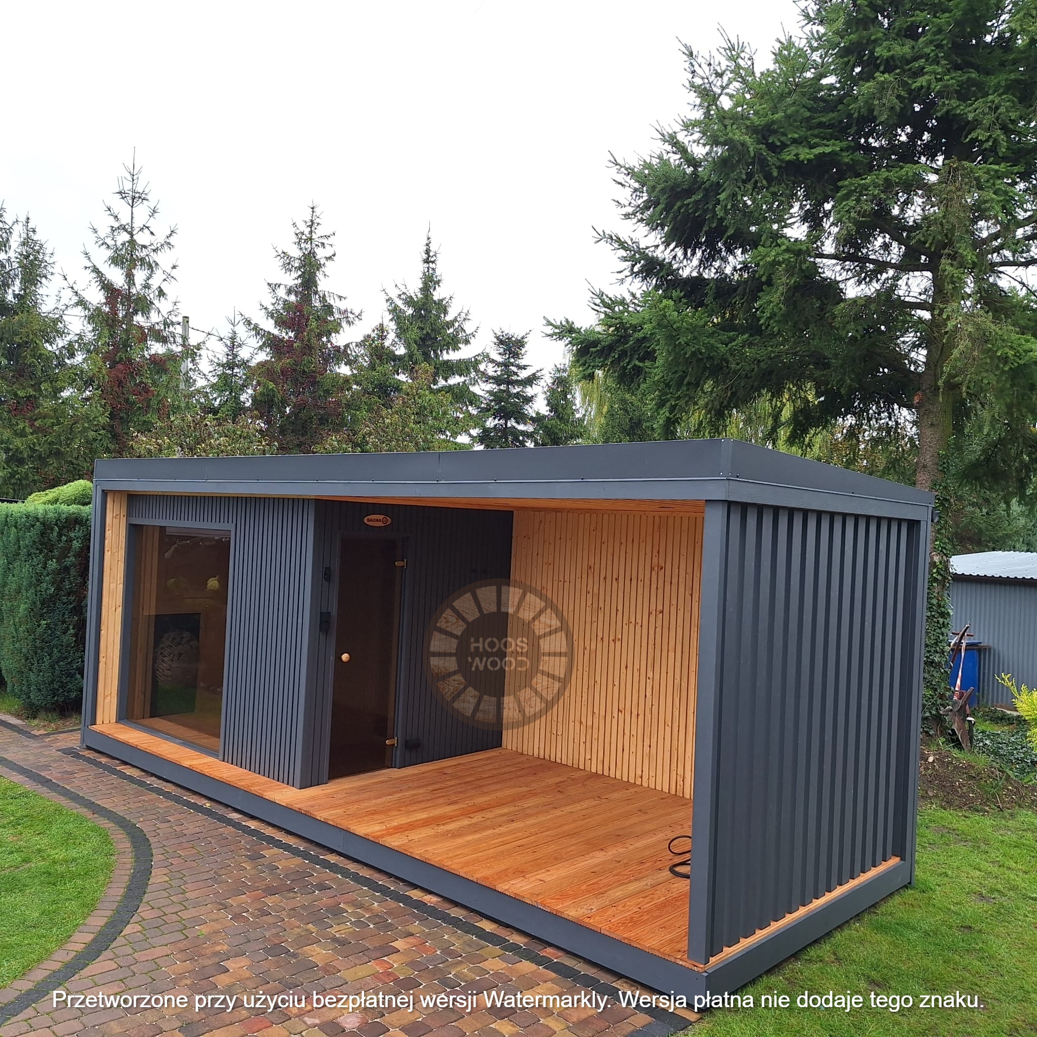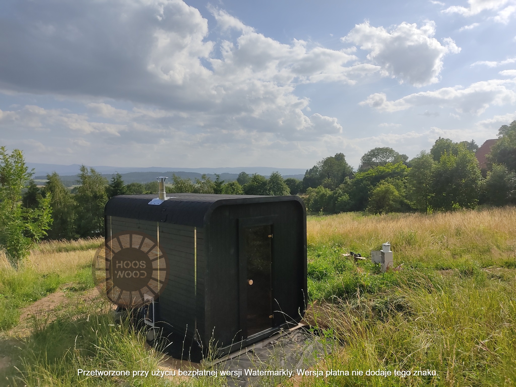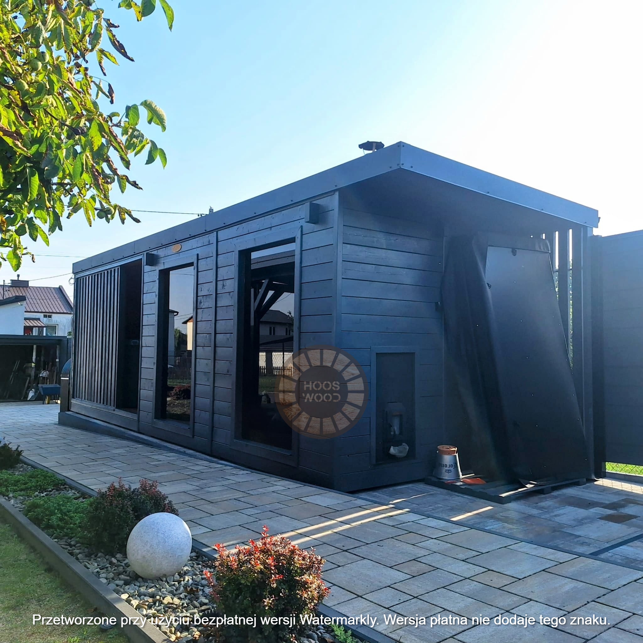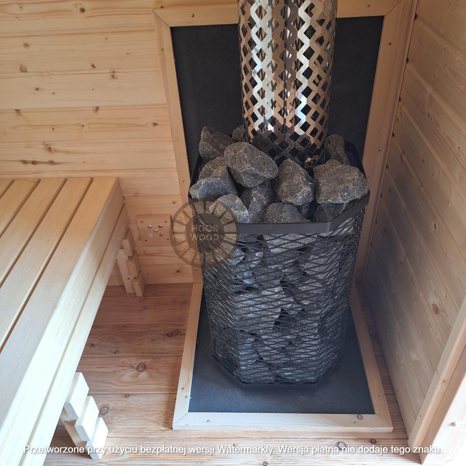 Firma Hoos Wood przedstawia saunę o wymiarach 2,40 × 5,60 m, tworzoną na indywidualne zamówienie (maksymalna długość modułu – 6 m). Sauna posiada pomieszczenie saunowe 2 × 2 m oraz taras przystosowany pod balię. Całość jest ocieplona 10 cm wełną, zabezpieczona folią paroizolacyjną i paroprzepuszczalną oraz deską elewacyjną dwustronną. Podłoga składa się z 5 cm styroduru, 8 cm kantówki i deski tarasowej. Konstrukcja stoi na trzech podstawach 10 × 10 cm, podbitych gumą dla ochrony przed wilgocią. Wyposażona w piec Harvia Cilindro PC 90 (opcjonalnie piec na drewno) z zabezpieczeniem ognioodpornym. Posiada podwójną wentylację, ławki dwupoziomowe z drewna abachi i hartowane, przyciemniane szyby 8 mm. Dach pokryty jest blachą, na spadzie montujemy rynny. W saunie zamontowano kinkiety drewniane z opcją LED oraz zewnętrzne oświetlenie.