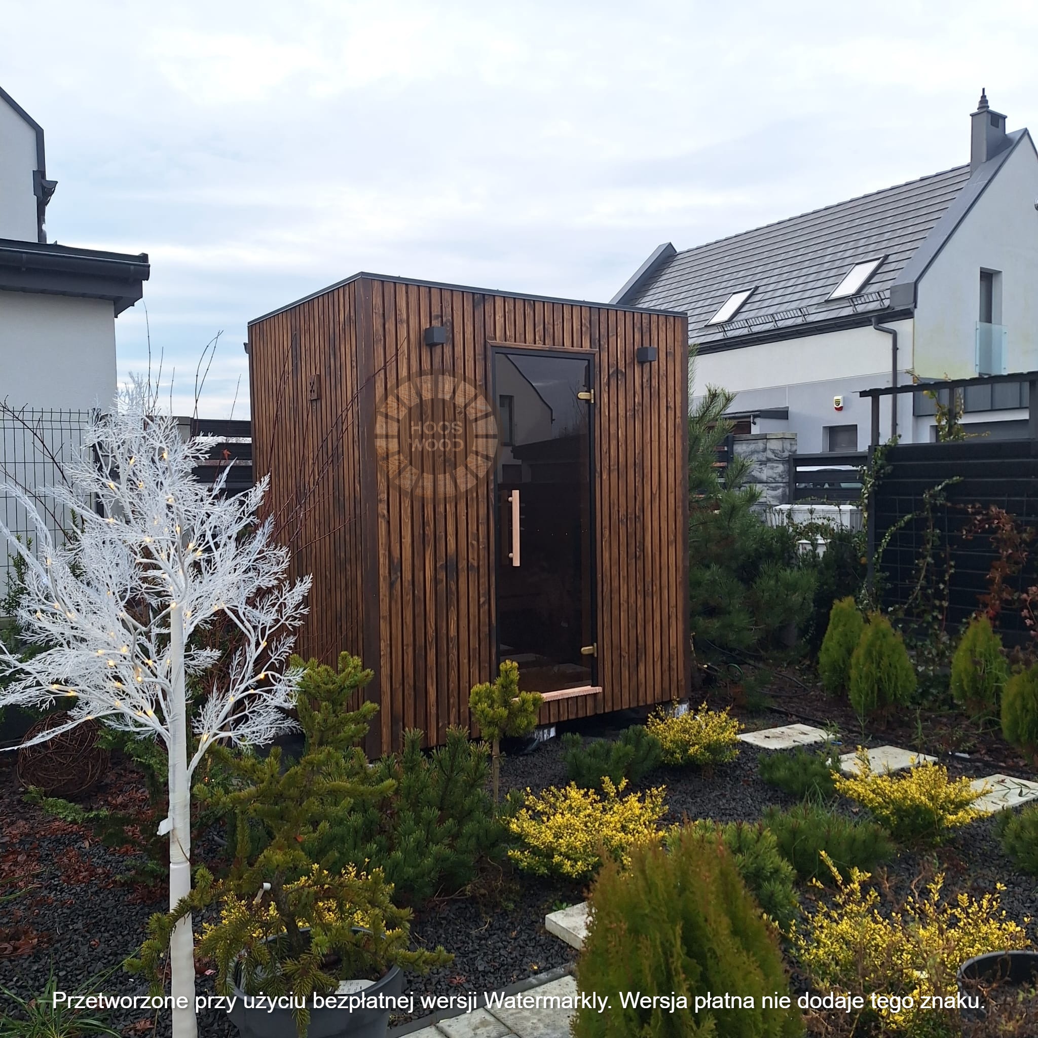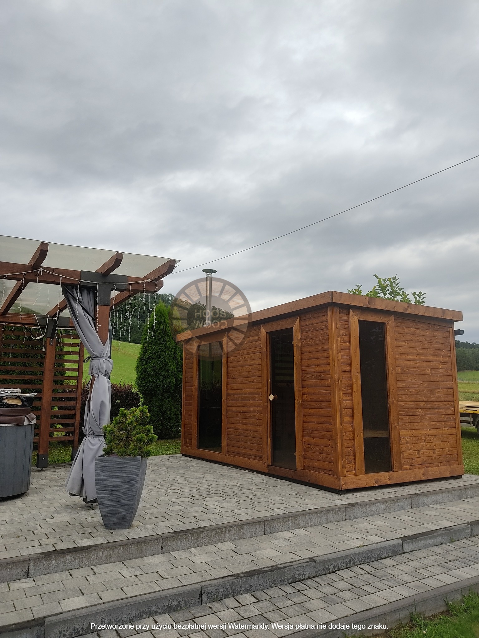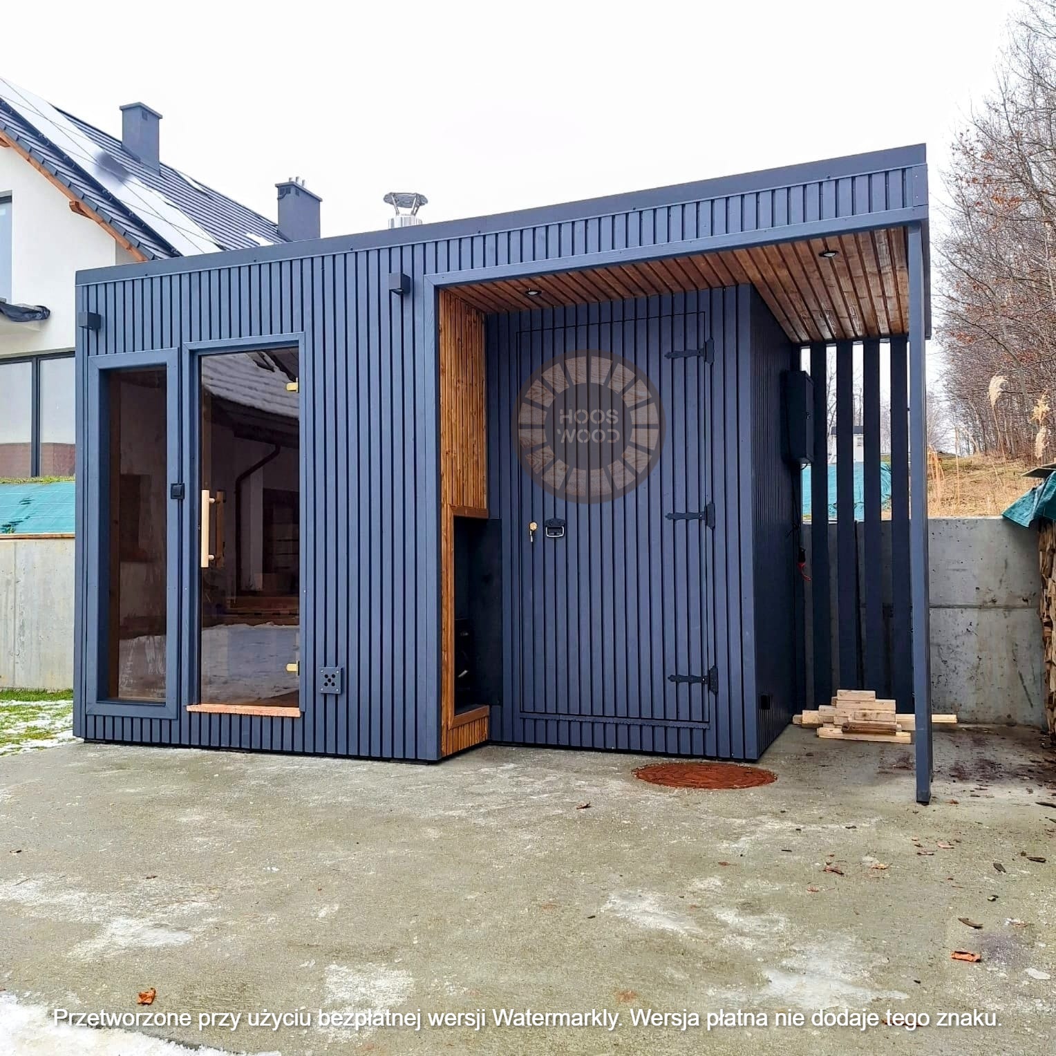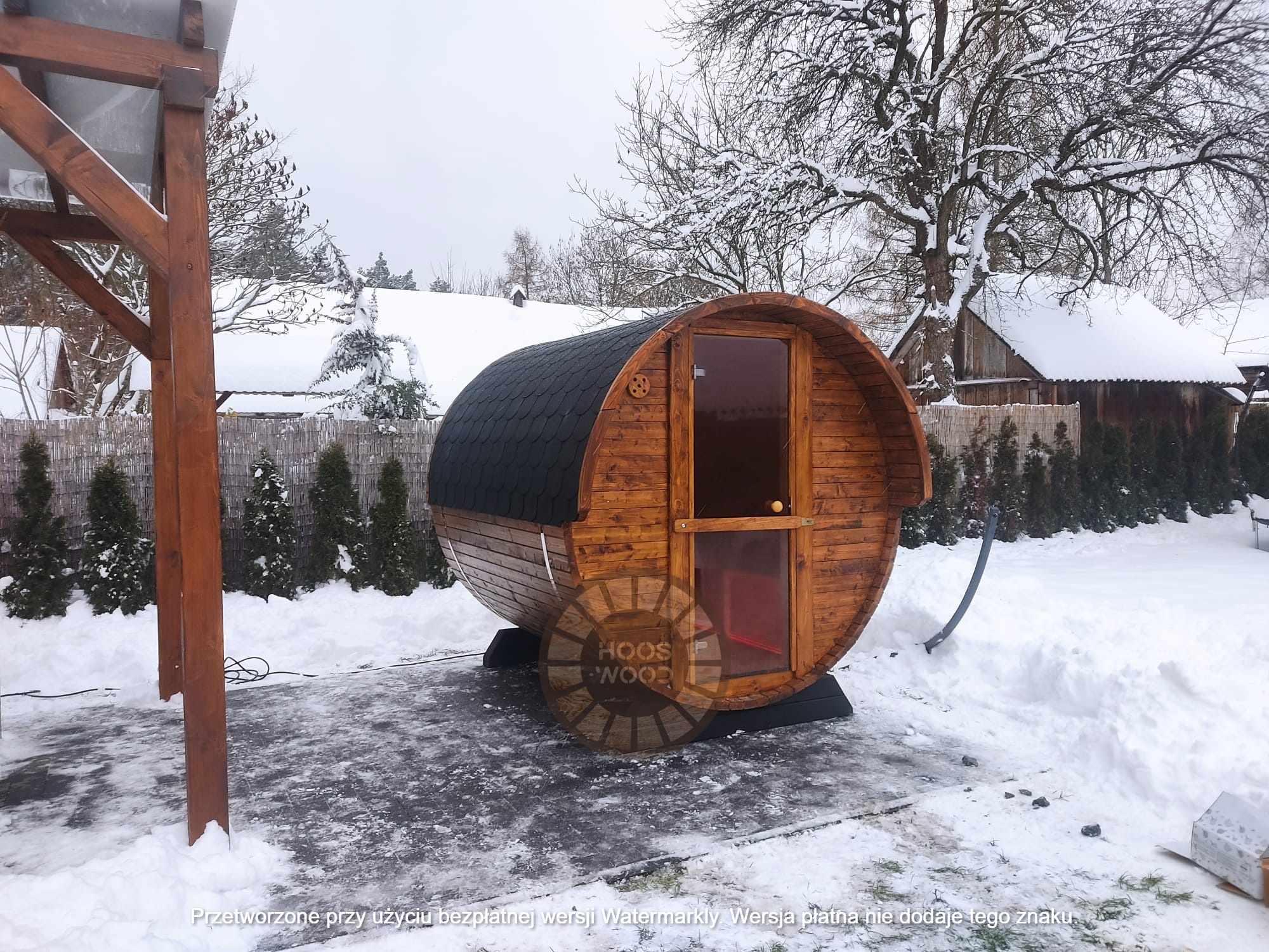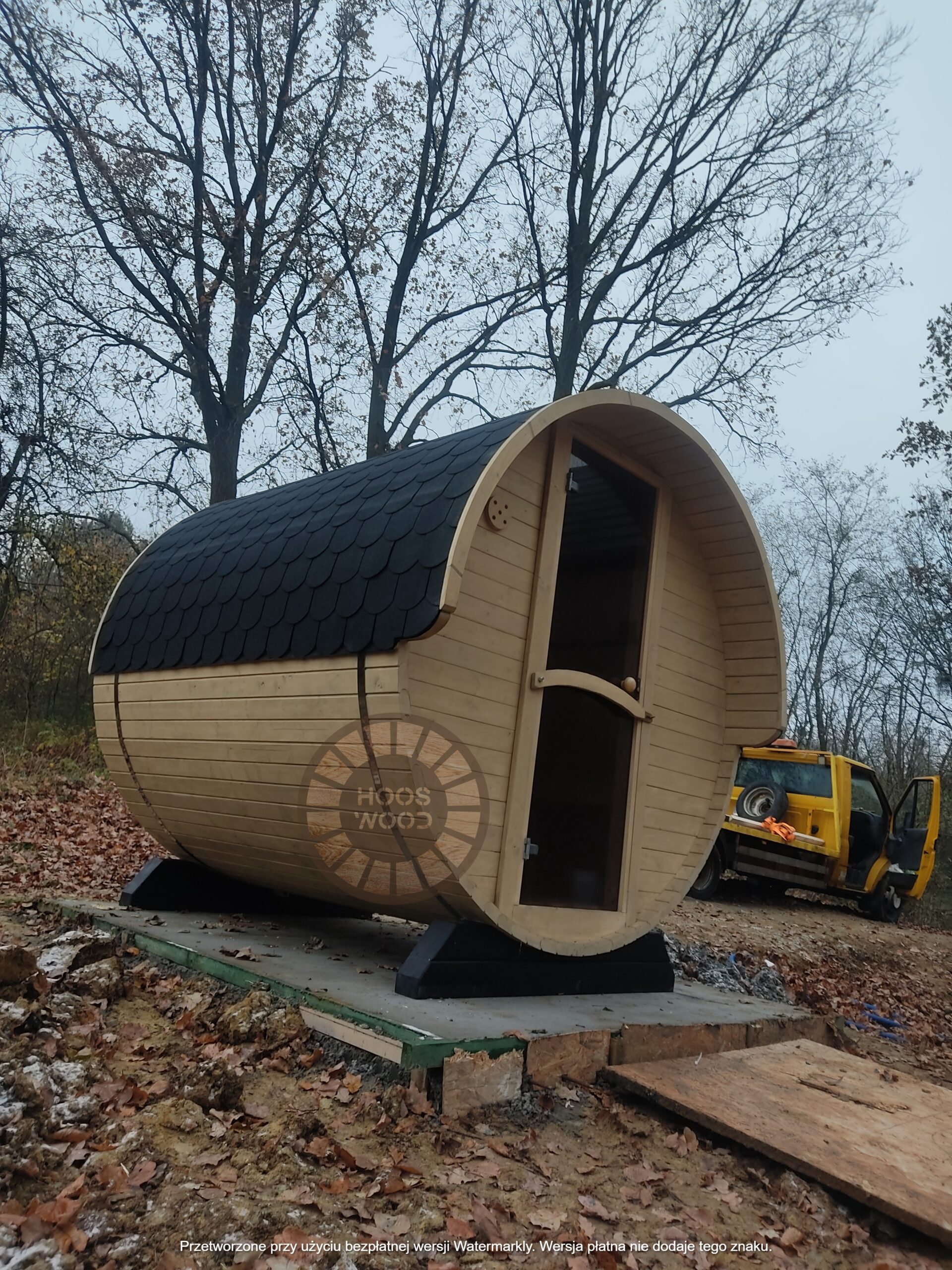 Firma Hoos Wood przedstawia saunę o wymiarach 2,40 × 5,60 m, tworzoną na indywidualne zamówienie (maksymalna długość modułu – 6 m). Sauna posiada pomieszczenie saunowe 2 × 2 m oraz taras przystosowany pod balię. Całość jest ocieplona 10 cm wełną, zabezpieczona folią paroizolacyjną i paroprzepuszczalną oraz deską elewacyjną dwustronną. Podłoga składa się z 5 cm styroduru, 8 cm kantówki i deski tarasowej. Konstrukcja stoi na trzech podstawach 10 × 10 cm, podbitych gumą dla ochrony przed wilgocią. Wyposażona w piec Harvia Cilindro PC 90 (opcjonalnie piec na drewno) z zabezpieczeniem ognioodpornym. Posiada podwójną wentylację, ławki dwupoziomowe z drewna abachi i hartowane, przyciemniane szyby 8 mm. Dach pokryty jest blachą, na spadzie montujemy rynny. W saunie zamontowano kinkiety drewniane z opcją LED oraz zewnętrzne oświetlenie.